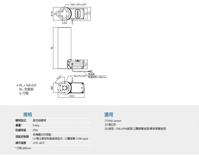 是個平穩、靜音的致動器,可單柱安裝於機架或二柱安裝可同步做升降,靠控制系統程式補償使台面上不均的問題可得到平行穩定的驅動。 |