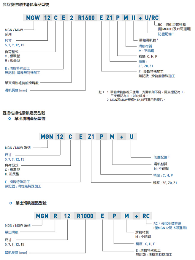 MGN 體積小、輕量化,特別適合小型化設備使用。 滑塊、滑軌材質提供不鏽鋼及合金鋼兩種。不鏽鋼材質之線性滑軌,包含滑塊、滑軌及其它金屬配件如鋼珠、保持器等,皆使用不鏽鋼材質,具備防鏽的特性。 採用哥德型四點接觸設計,可承受各方向負荷,具備剛性強,精度高等特性。 有鋼珠保持器設計,在精度允許下具備互換性。 MGW﹝寬幅﹞ 加寬滑軌之設計大幅提升力矩負荷能力,可單軸使用。 哥德型四點接觸設計,可承受各種方向之負荷並具有高剛性之特點。 滑塊裝有微小型保持鋼絲,取下滑塊鋼珠也不會脫落。 滑軌、滑塊及所有金屬配件均採用不銹鋼材質,具抗腐蝕之特性 |